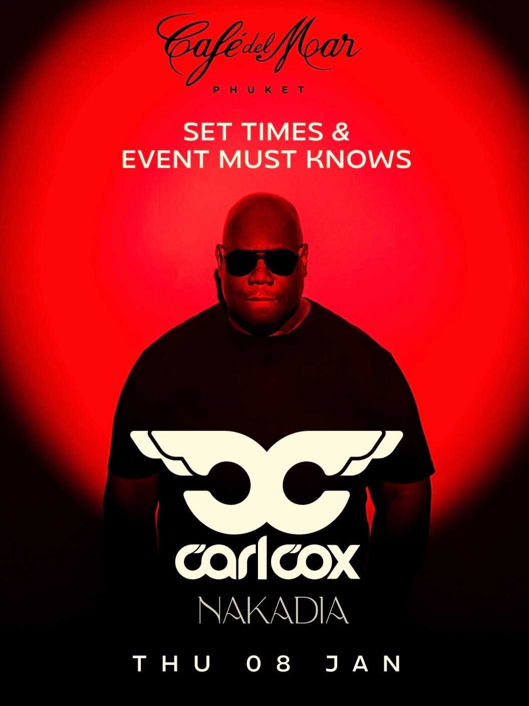 Carl Cox lands in Phuket for his debut at Café del Mar on Thursday, January 8, 2026.