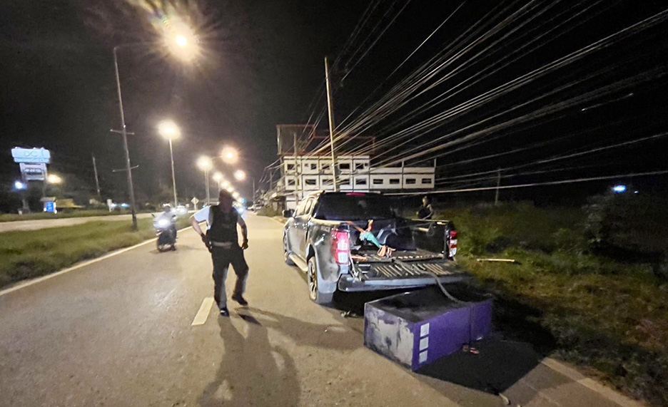 Police say the suspect, identified only as Mr. S, allegedly dragged the Siam Commercial Bank ATM from its base outside the Sri Sawat store on Maliwan Road in Ban Thum subdistrict. He then loaded the machine onto his black Mazda pickup truck. Drag marks stretched around 20 meters from the ATM site to where the truck was parked.