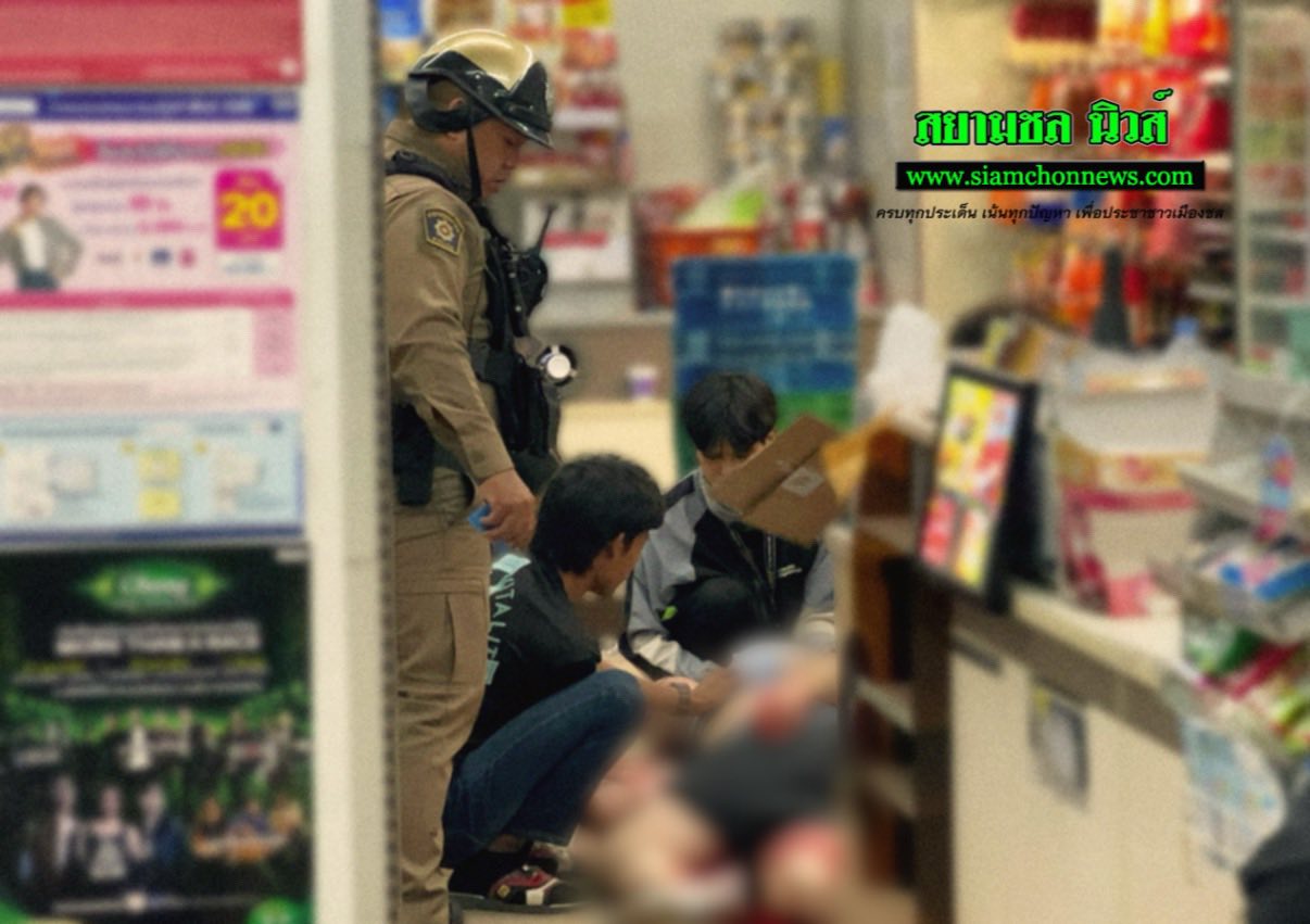 Police said the incident took place at about 1.06 a.m. at a well-known convenience store on Jomtien Beach Road. Officers from Pattaya City Police Station responded to reports of a violent assault involving a foreign national. Volunteer rescue workers from Sawang Boriboon Thammasathan Pattaya, a local charitable foundation that provides emergency medical services, also attended the scene.
